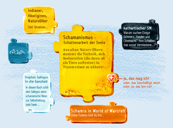 Da gehts in die Puzzlewelt hinein: immer ein grosses Puzzle in der Mitte, und drumherum lauter kleine Puzzles - dort könnt ihr hinspringen wie von Eisscholle zu Eisscholle... Ach, vielfädig verknüpft ist die Welt.